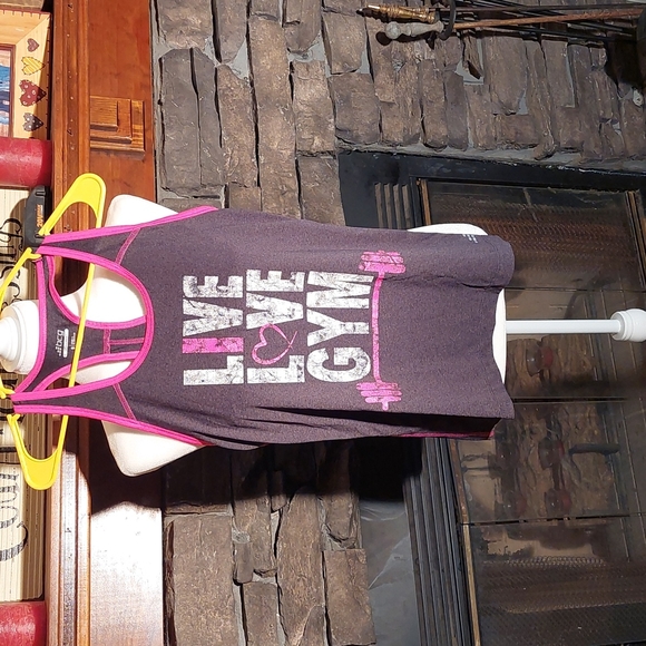 very cuteblack tank top with pink trim, writing says: live, love, gym.
