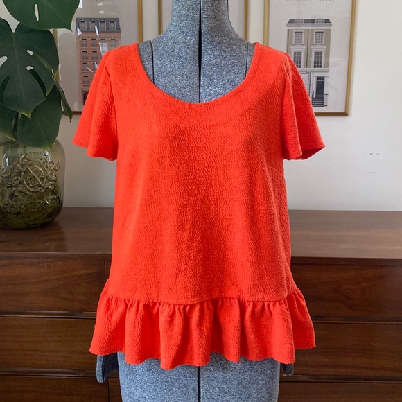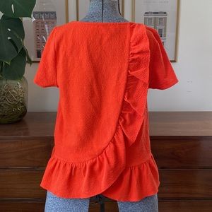 Beautiful vibrant top with a surprise back. Color is a bright red orange with lots of stretch to it. Could fit a large.