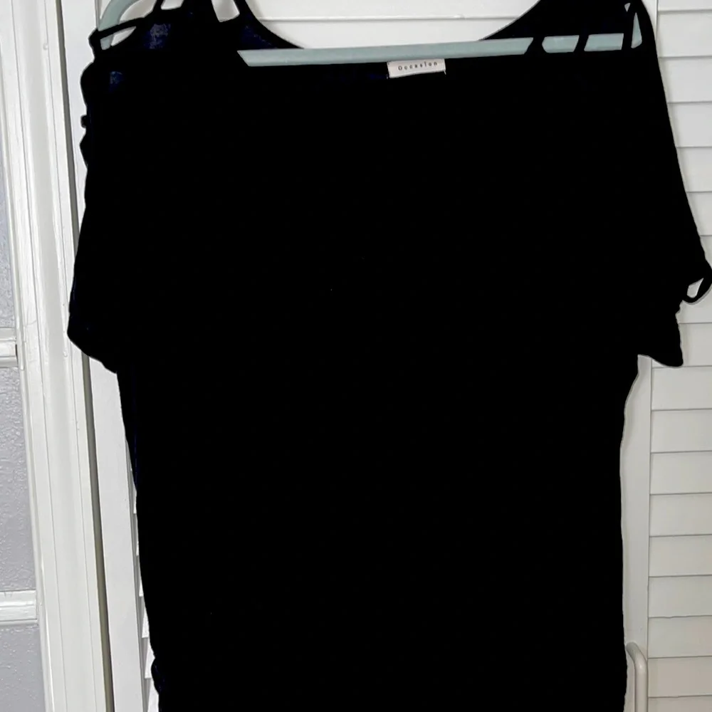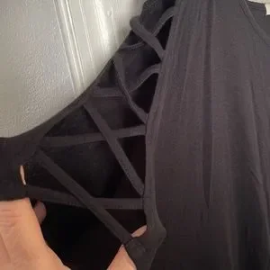 Black wider scoop neckline t top. Short sleeve with lattice side cutouts. Smoke free pet free home