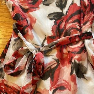 One shoulder top. Waist tie. Left are sheer flowy sleeve crochet along the sleeve excellent condition. Worn 2x white with rose pattern black and red.