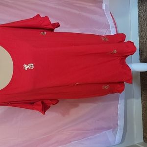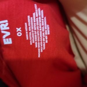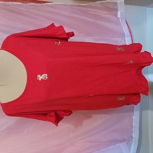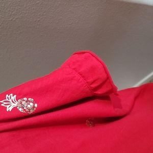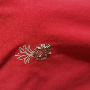 Red short sleeve top with pineapple decorations. Has ruffle around edge of sleeve and bottom of shirt.