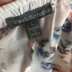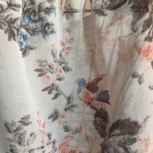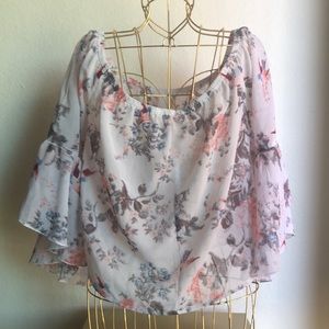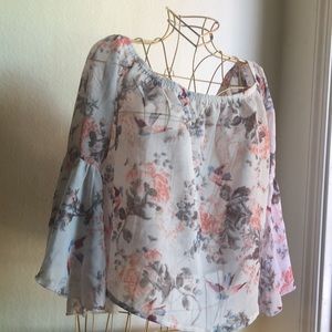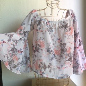 Sits off the shoulder. Translucent fabric with floral print. Wide flowy sleeves. Lightly worn good condition
