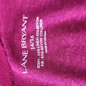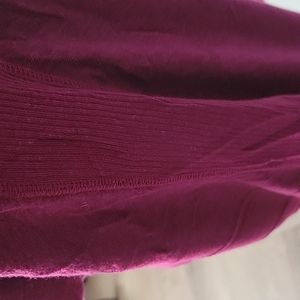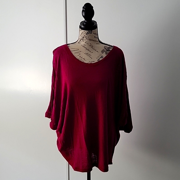 Short sleeved top with dolman sleeves. Ribbing on sides. Small ribbed band on bottom. More of a maroon color.