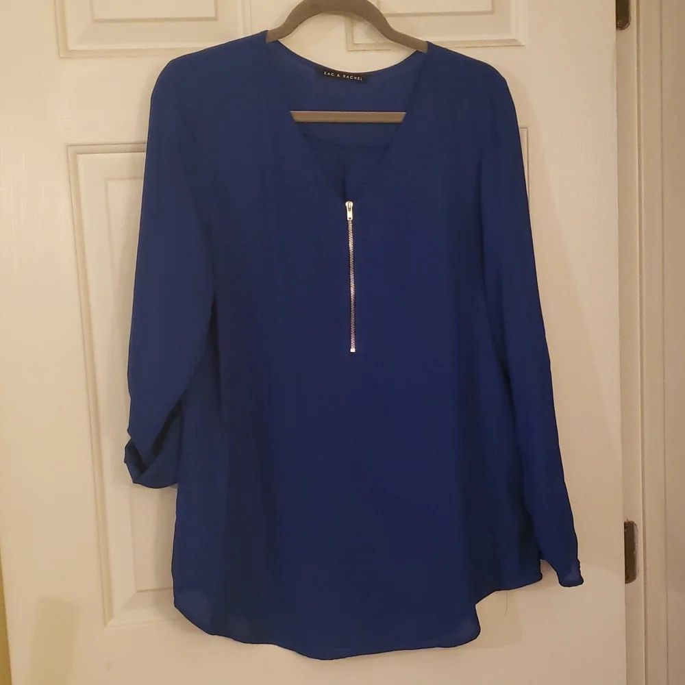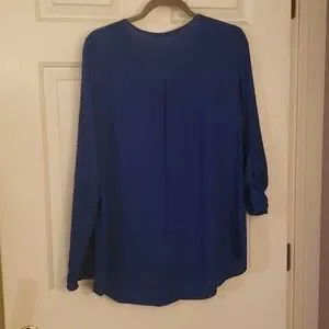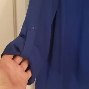 Pretty top! Sleeves roll up and button but I personally don't like the look and always just wore the sleeves down. But I took pic with one folded up and the other down. This is royal blue.