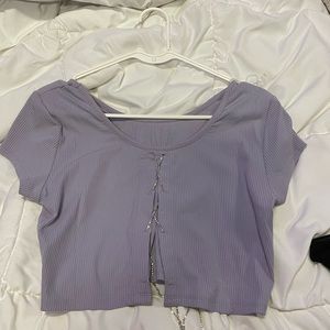 Light purple top you can wear it either way doesn’t have a tag but I’d say it fits medium/large