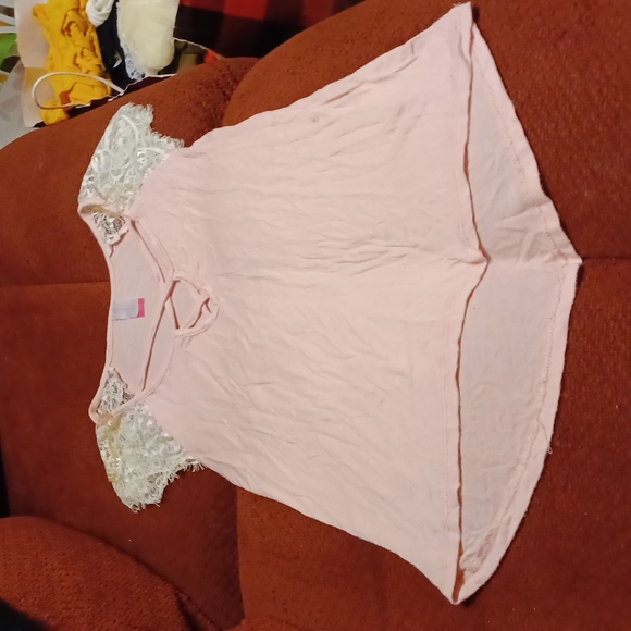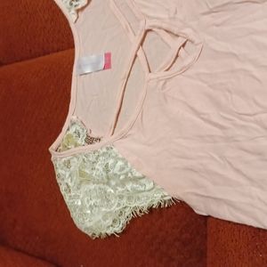pink high low hem with white lace sleeves, short with criss cross design on front