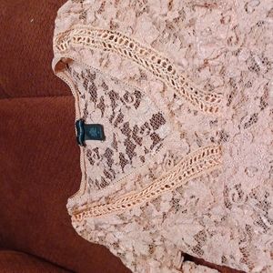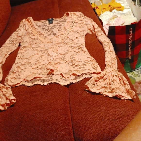 pink all lace see threw long sleeve belled sleeve v neck with embrodered front. worn once.