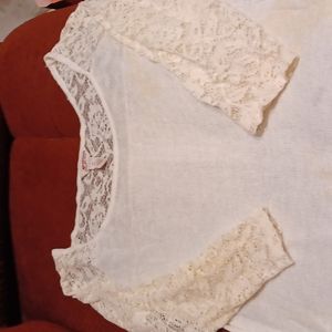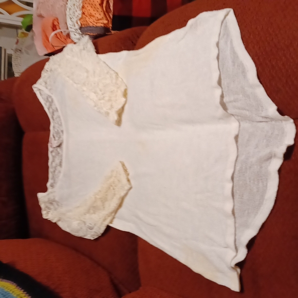 cream color sweater with lack back shoulders and top with 3/4 lace sleeves high low hem
