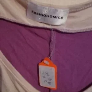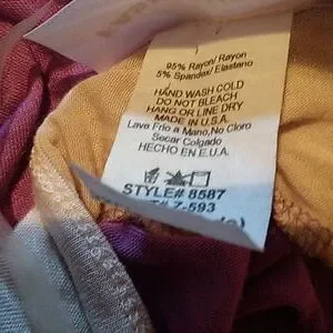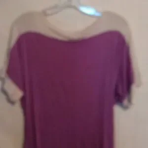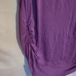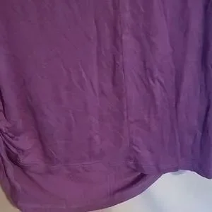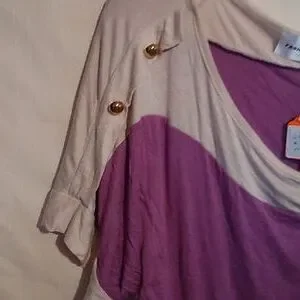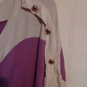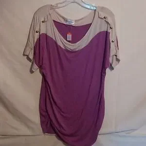 purple and tan top w/ gold buttons on the sleeves and gathered on 1 side 95% rayon and 5% spandex