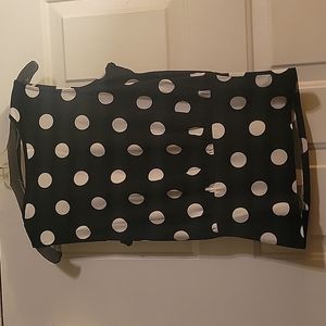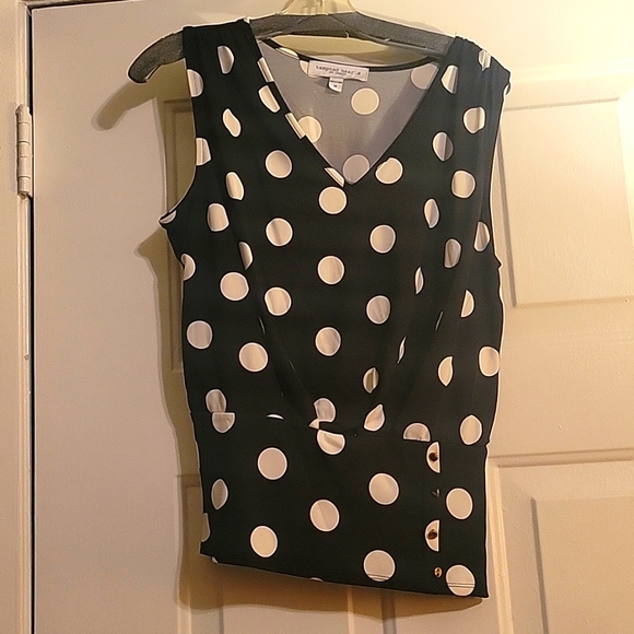 This is a nice short sleeve pocka dot top. It contours around the waist and features a V neck line.