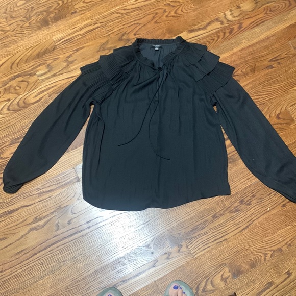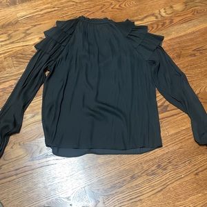Black, polyester, pleated ruffles on shoulder, new, never worn.