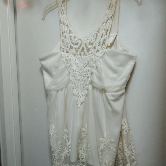 One top, lace sleeves, armless, lace down the front and lace design around the bottom; has elastic in the back with side zipper. lined, fitted loosely under the bust.