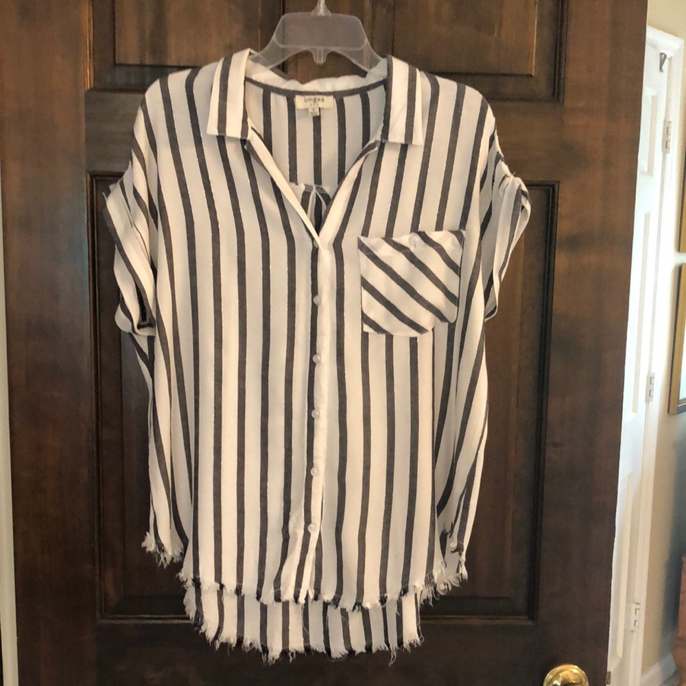 Umgee small dark gray/white with hint of silver lining striped button down shirt. One breast pocket. Frayed hemline.