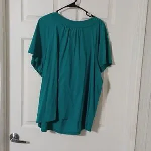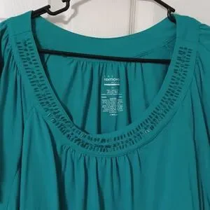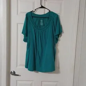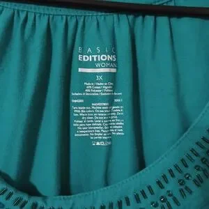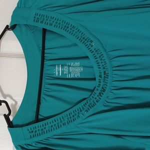 Teal shirt with gems/beads around front collar of shirt.