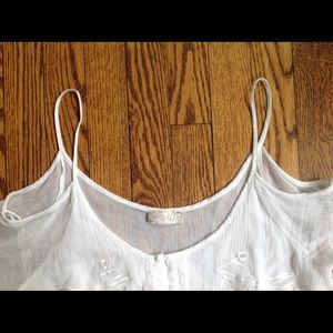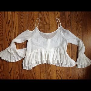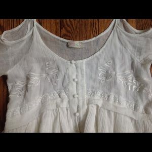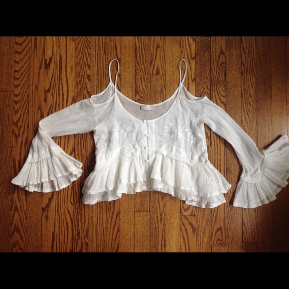 Free people crop top. 100% cotton. Embroidered floral detail on chest with working button enclosure up center. Open shoulder with strap to hold in place and fun bell sleeve by wrist. It's very fun! Off white