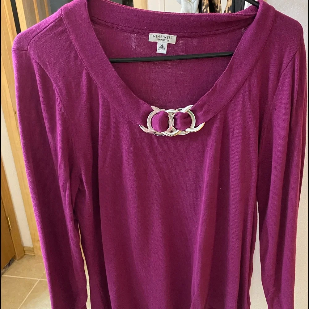 Top with gorgeous silver links across the top front with 1/4 sleeves. Fits more like a medium than extra-large.