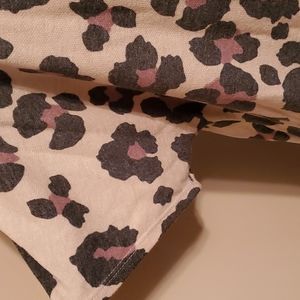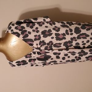 This top can be worn with the design in the front or the back!! Lightweight sweater material. Heathered Khaki, Black & Brown Animal print. Can wear along or as a layering piece. Smoke Free home. No tags so not sure what its made of or brand.
