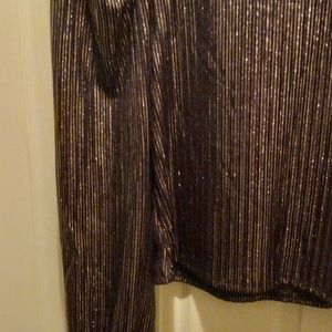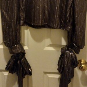 Top, has 3/4 length sleeves, with ties on the sleeves to be tied into a bow, the fabric is gold metallic, I also have a black metallic in a different listing