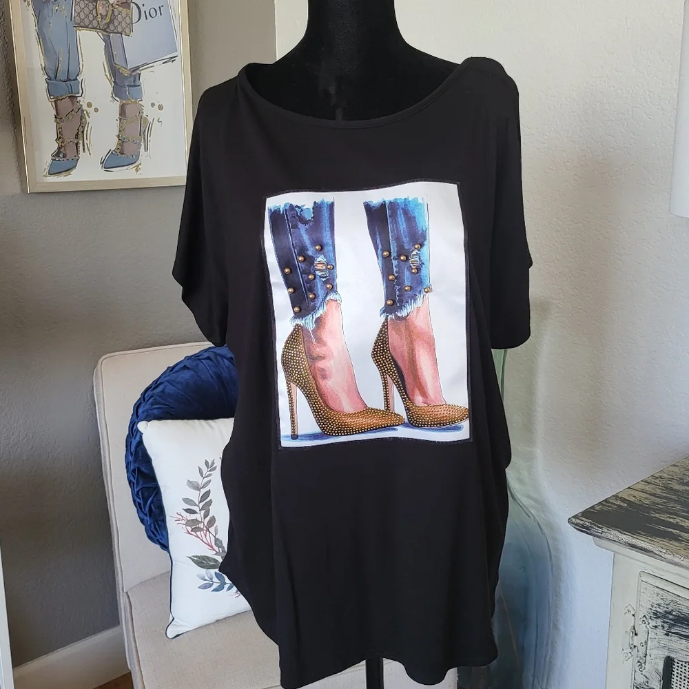 Black with design and rhinestones Loose fitting. One size. Fits sizes Small-Large NWOT