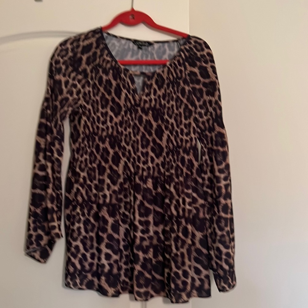 Leopard print blouse. Stretchy, tissue polyester with keyhole opening in front and bell sleeves. Babydoll shape. Worn once!