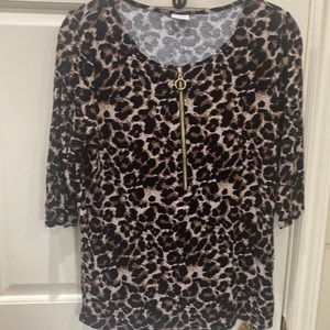 Here’s a lovely animal print three-quarter sleeve top with beautiful center gold zipper by Lascana. Their clothes are very flowy and have a bit of spandex in them. In pristine condition never worn without tags. What makes us so nice is a three-quarter sleeves and a great animal print. The size is a 4/6 . But I would say that it would fit a medium or a large because of the spandex.