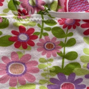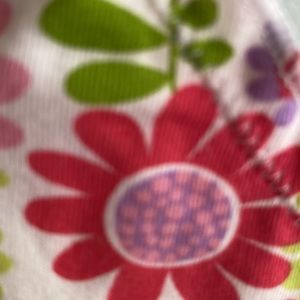 What a beautiful daisy flower encrusted cami. It is so bright and cheerful with a beautiful neck ruffle and small satin bow. This is new without tags never worn. It has a nice stretch and adjustable straps. The colors on this are so vibrant with shades of green, pink, coral lavender and white. I know you’ll love it. This is 95% cotton and 5% spandex.