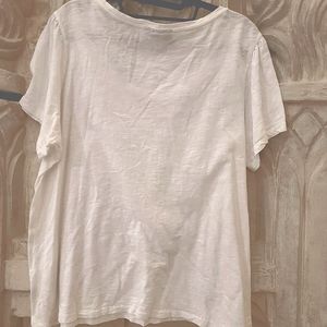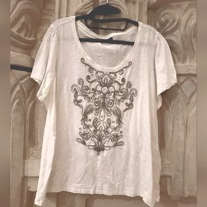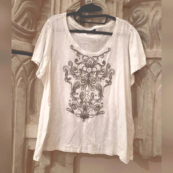 White cotton top with silver being added to the front of it!!No stains or tears. Beautiful shirt