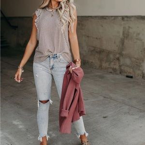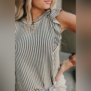 NEW The Ruffle Me Up Top features a crew neck, slim fit style that will fit most body types. The ruffled design of this striped tank makes it elegant and chic.