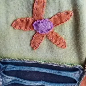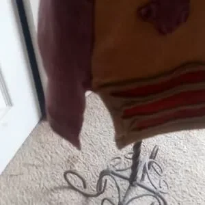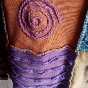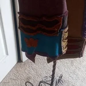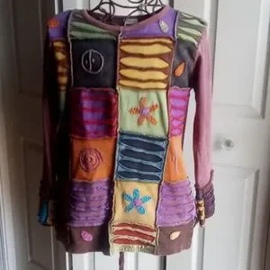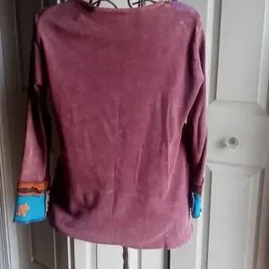 100% cotton multi panels with embroidery and slit rolled fabric. wine colored back.