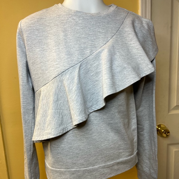 Gray Long sleeve top with a large ruffle going across the front of the top