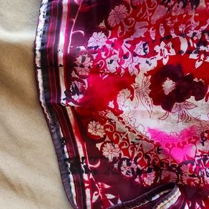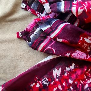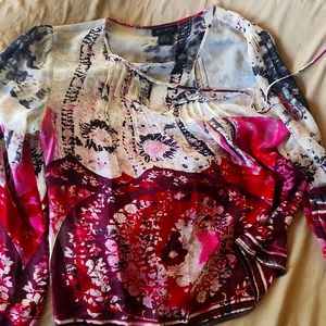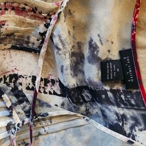 Women's sheer 100% silk print top, with pleats at v-neck and ties. Print is burgundy wine, gray, black, and taupe, size M fits 6-8.