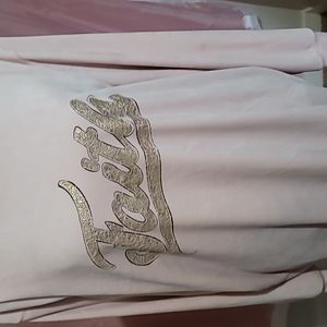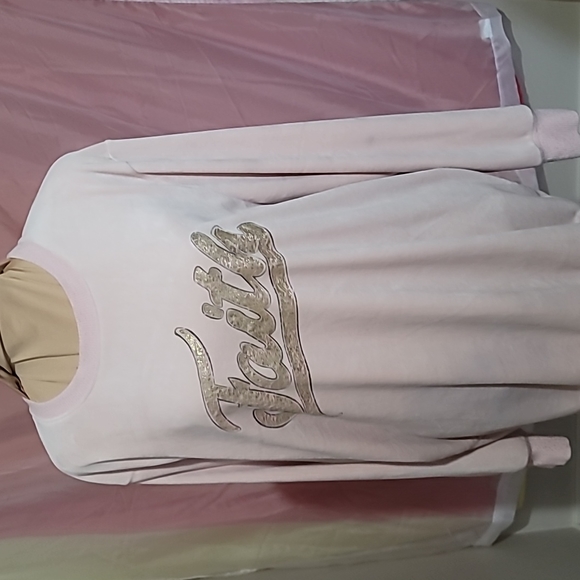 This blush pink top is a soft velour type material with long sleeves. It has the word Faith on the front.