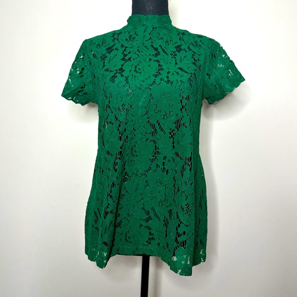 Green lace top with a half zipper in the back and the lower back is open. It’s brand new never been worn, don’t have the tags. 55% Cotten 45% Nylon