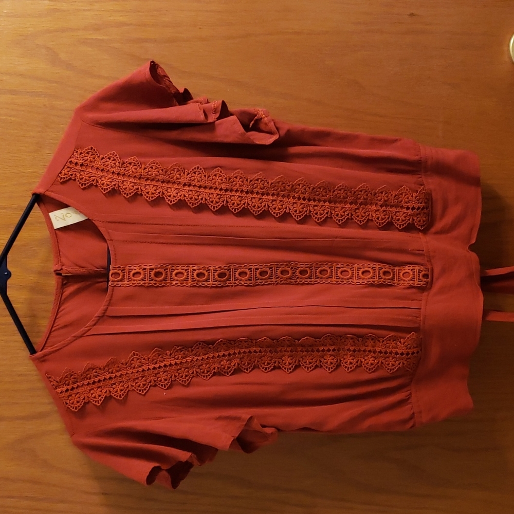 Rust colored top with flutter sleeves and tie in back. Very feminine and perfect for spring. Like new.