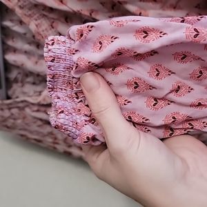 pinks and red long sleeve shirt. bunches at the end of the sleeves.