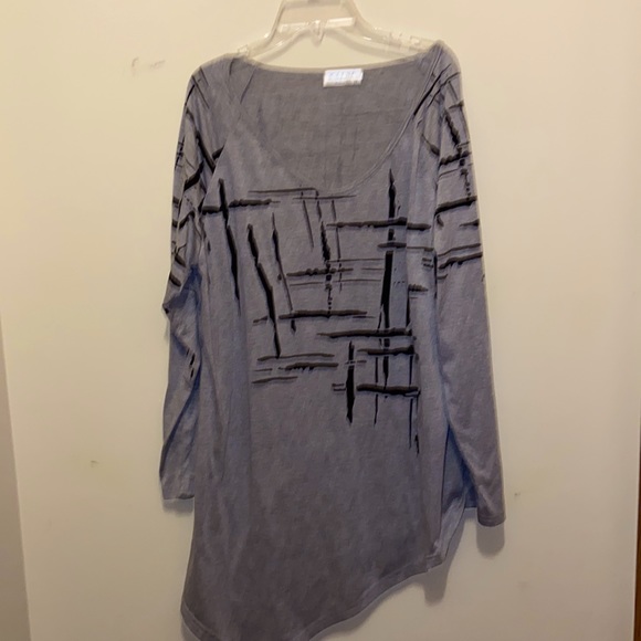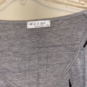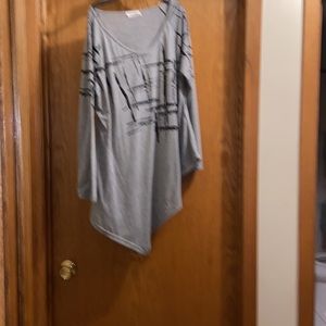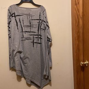 Grey and black knit top with slash markings. Could be subtle Chinese? You tell me