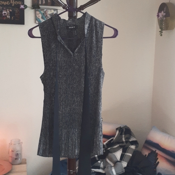 sleeveless top size12 v neck tie on neck pleated at bottom black tie .black and white pretty top