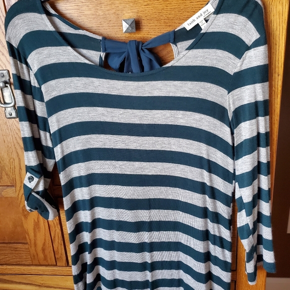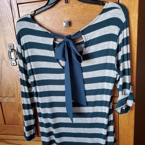 Cute gray & dark green striped top with pretty bow on back. 3/4 length roll-tab sleeves. EUC.