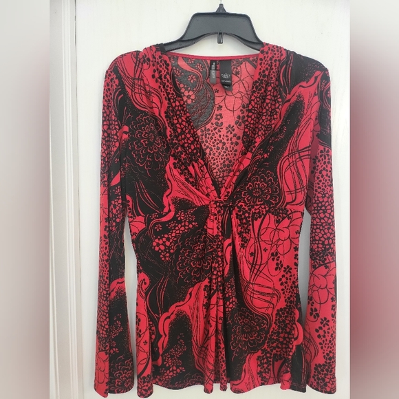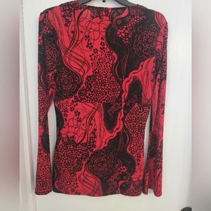 Bisou Bisou Red and Black Top with floral design, flared sleeves, knot in front size Medium