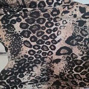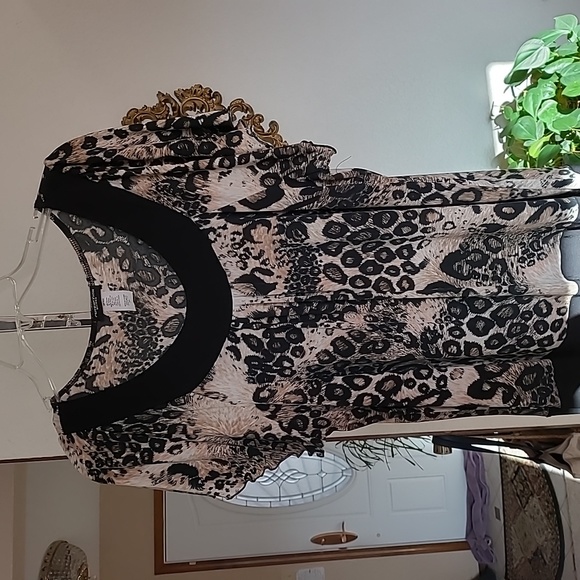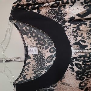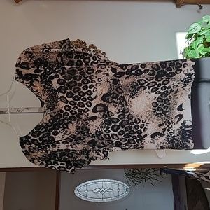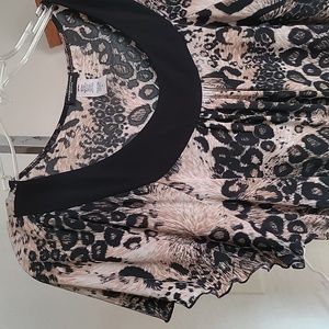 Animal print cream and beige print. Flutter sleeves. Black defining collar and hemline.