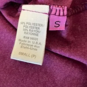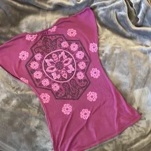 V neck tee, top. Size small. Wine color with black and light pink design on front and back. 50% polyester, 50 rayon. Previously owned, lightly used condition. Cute on.