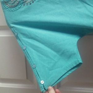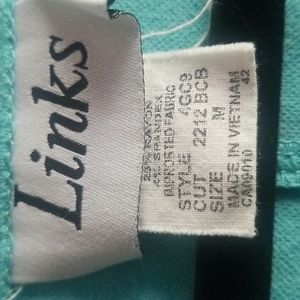 Links brand top. Tealish colored blue. Cute design on the front. Button detailing on the sleeves. Size M.