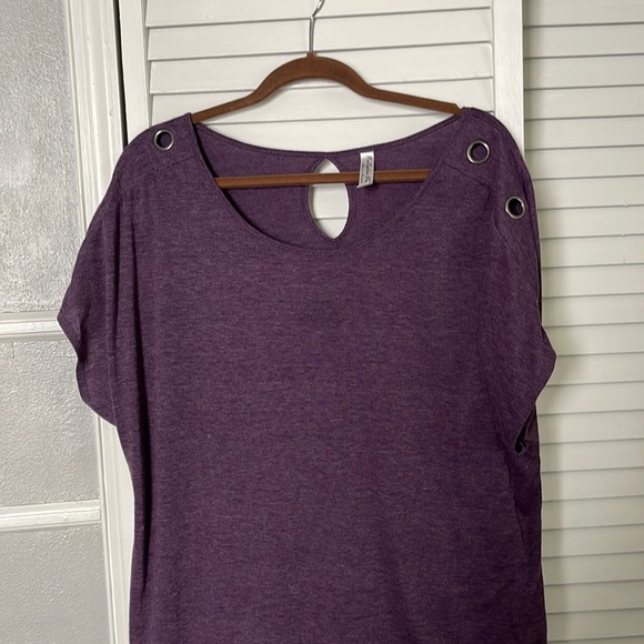 Heathery plum t top. Short sleeved adorned by 3 grommets along the sleeve. Cinched sides at bottom