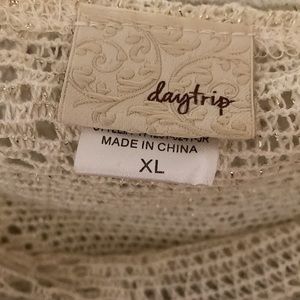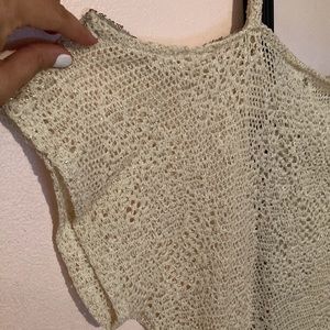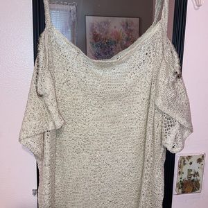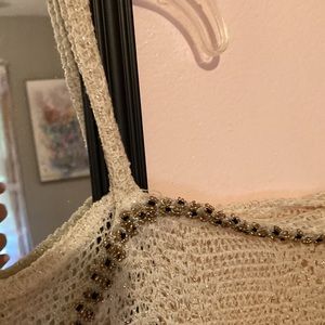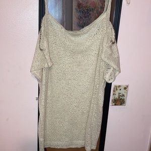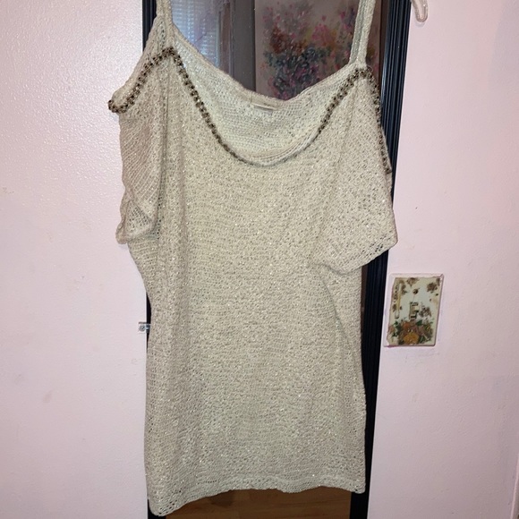 Beige-ish, off the shoulder w shoulder straps, shimmer, lace knit, beading at top