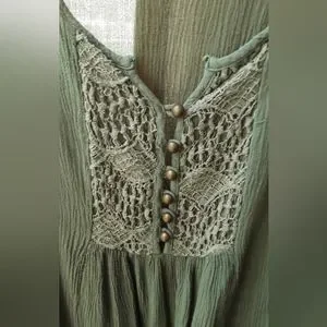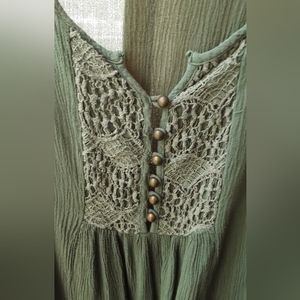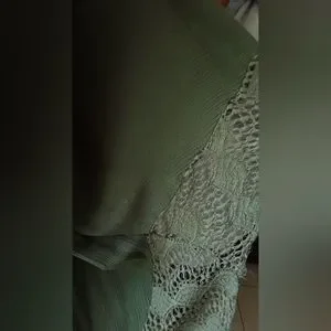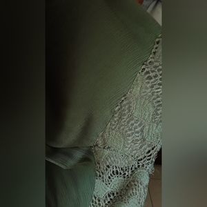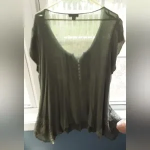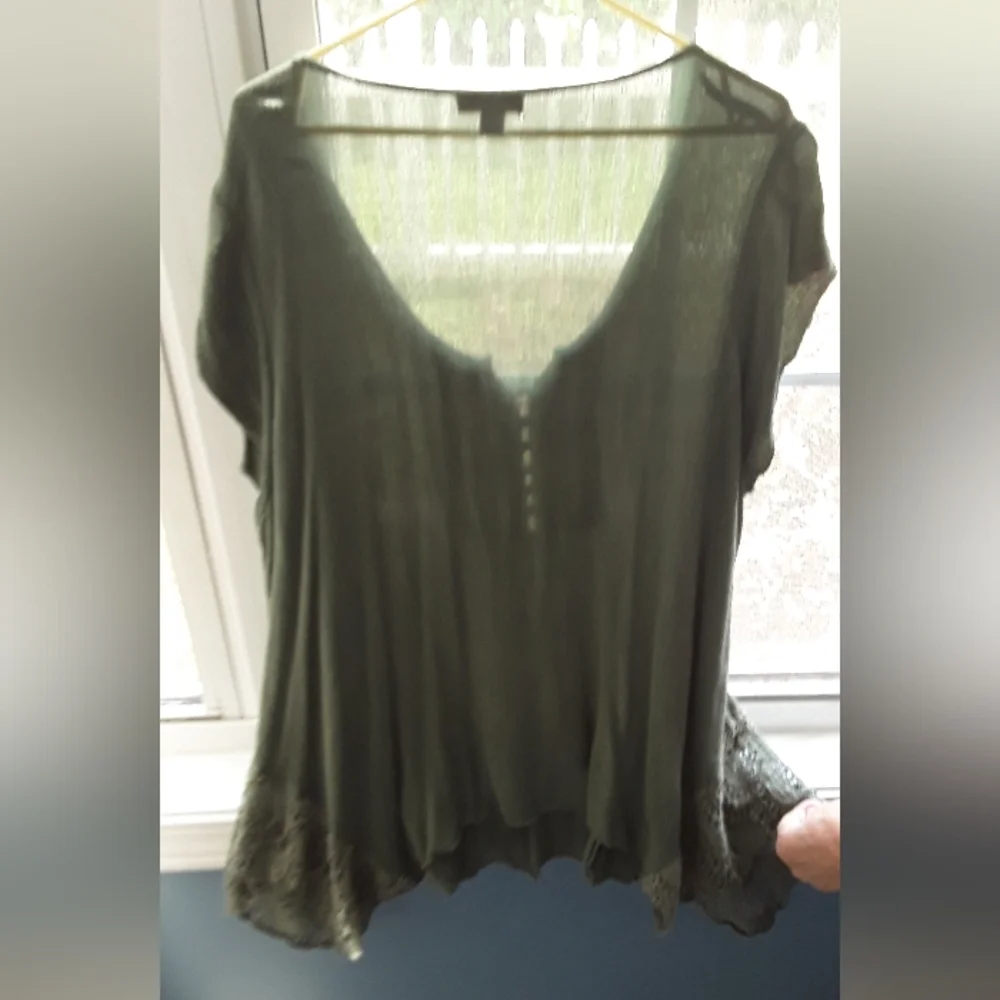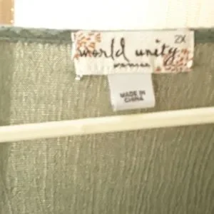 Top by World Unity. Olive green color with crocheted details on front and lower sides. Cap sleeves. Size 2X.