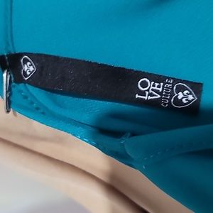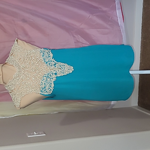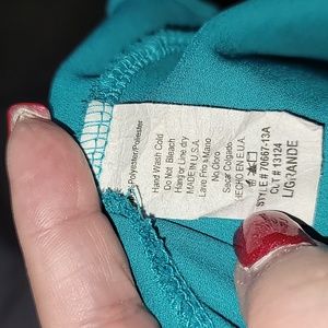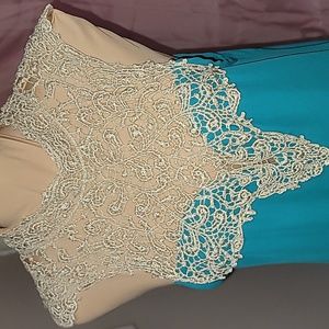 Beautiful teal green top a high low look. With a golden lace detail (crochet) around the neckline in a v pattern.