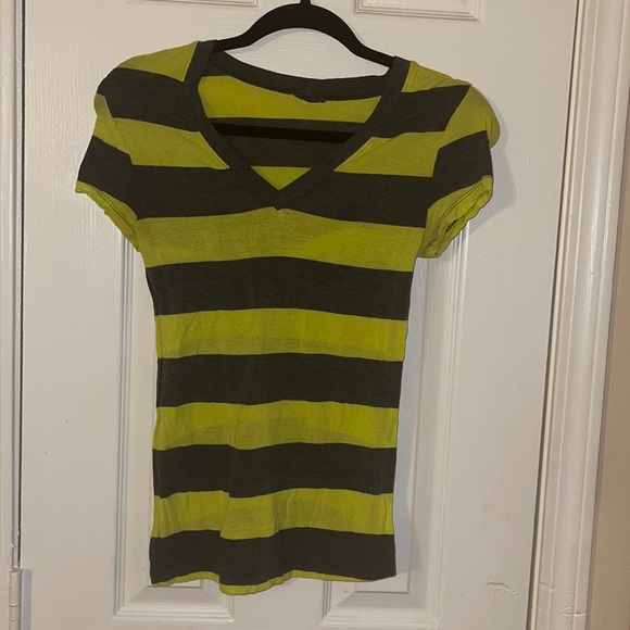 A very casual neon yellow and gray top worn several times
