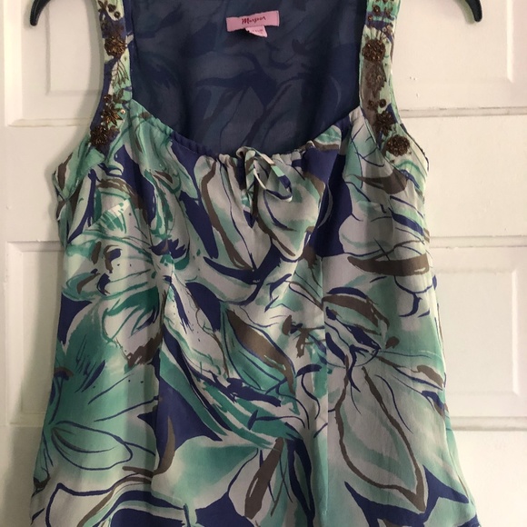 Silk Top with a lining. Beautiful with jeans. Bead work on the straps. Front tie side concealed zip! My favorite. Size 10 Uk, Europe’s 38. Blue multi