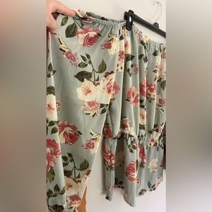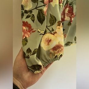 Off the shoulder top originally bought from Rue 21. Sleeves and waist are sinched to be tighter but areas have stretch. Full length top.