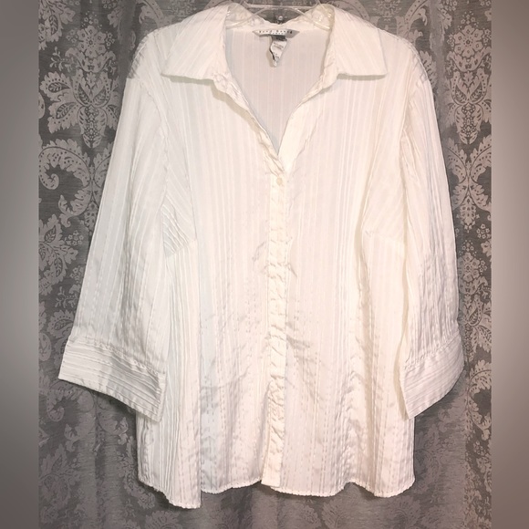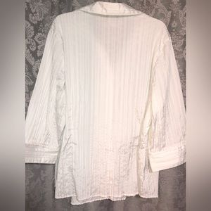 Used in great condition white dress top button down the front 3/4 length sleeves raised vertical stripes